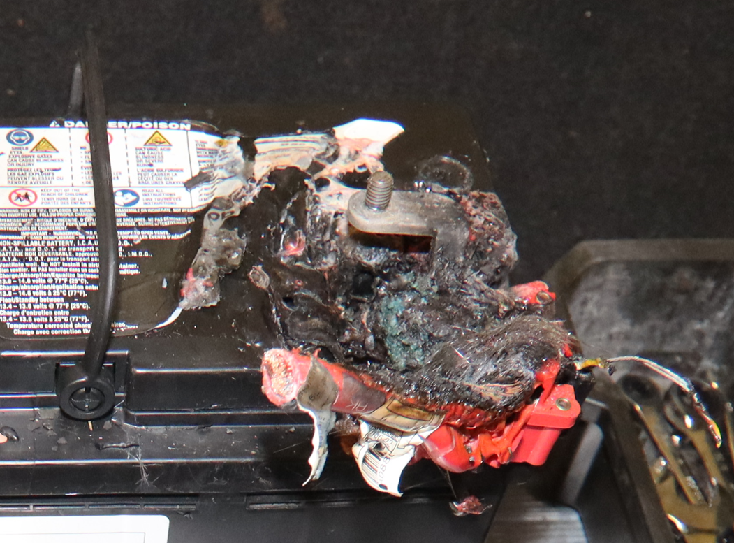 The failure point was traced to the B+ terminal where the cable meets the battery post. In a healthy system, this junction carries high current safely. But in this case, corrosion, a possible loose clamp, or hidden internal degradation created resistance. When current from the boost surged through the degraded connection, resistance heating ignited surrounding insulation.