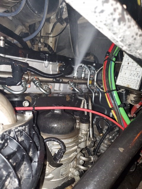 A fine, high-pressure stream of diesel spraying from a compromised line inside the engine compartment. • Heat accumulating near the turbo housing.